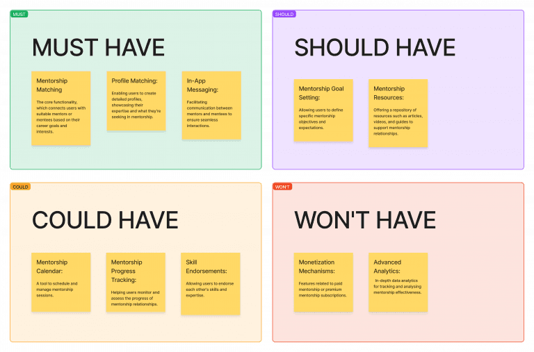 After ideating and brainstorming various features, I employed the MoSCoW method to prioritize them based on their criticality. This approach ensured that essential functionalities were addressed first, followed by those of lesser importance.