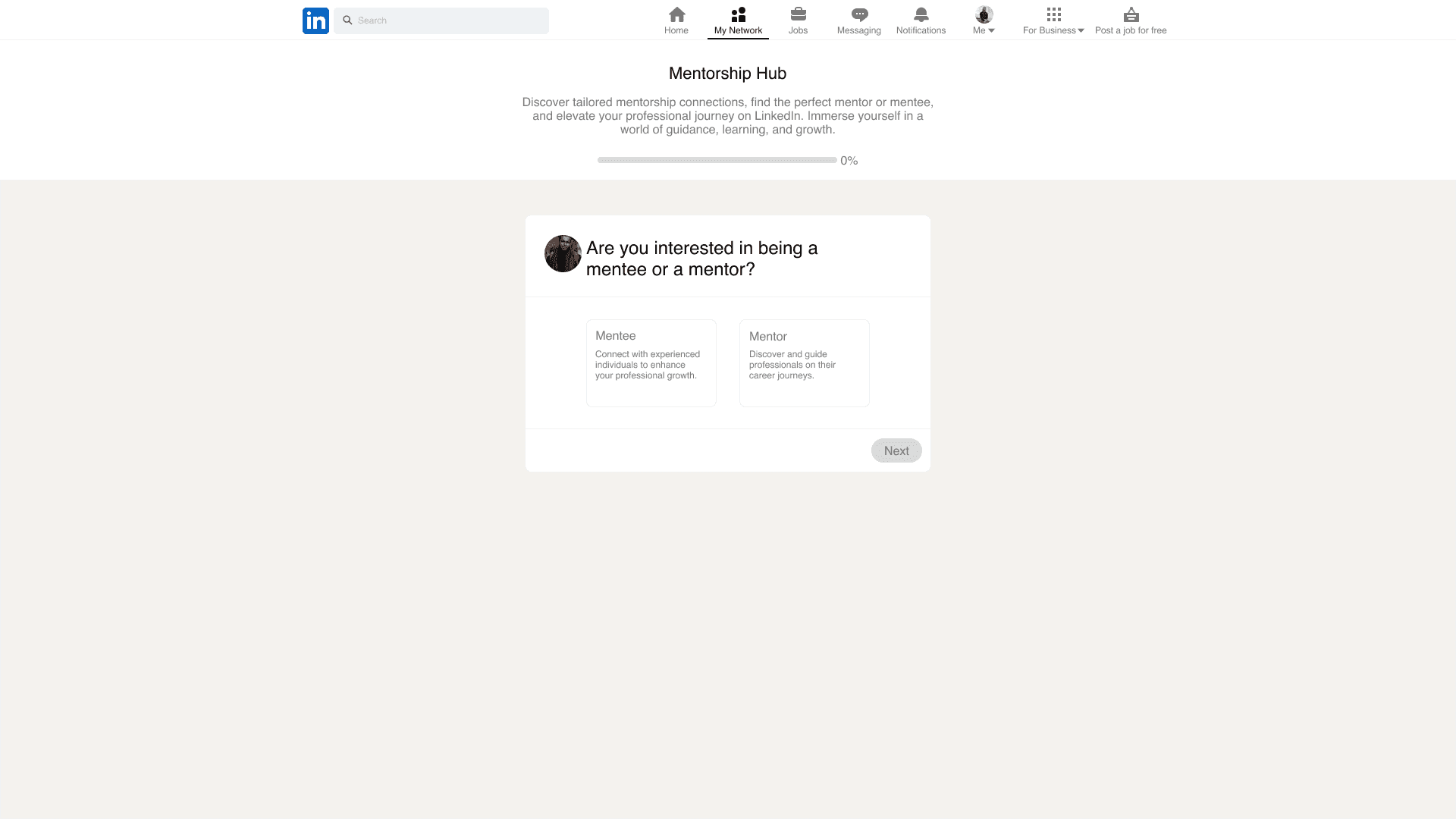 I then started making a digital prototype and initially, my sketches placed the mentorship feature within LinkedIn’s “My Network” section, which seemed logical and in alignment with LinkedIn’s previous approach in 2017. However, I recognized the importance of exploring alternative placements to ensure the best user experience.